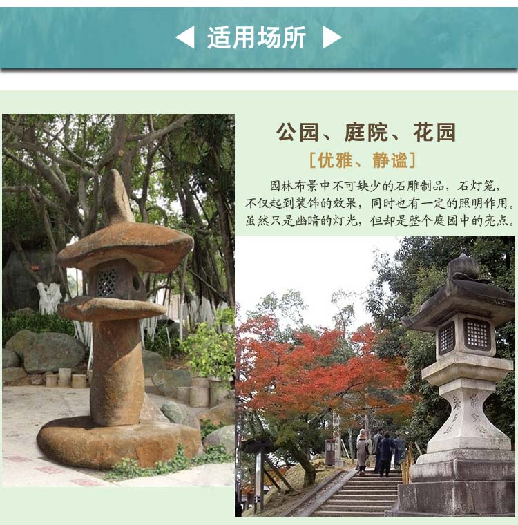 石燈籠是日本石文化的重要內(nèi)容之一,也是近年來我國出口日本石制品的一個(gè)重要品種。石燈籠在日本有著非常悠久的歷史。在佛前獻(xiàn)燈火是佛教的重要禮儀之一,自奈良時(shí)代 (公元 710~ 794年 )起日本在修建寺院時(shí)就開始在寺院的正面建造石燈籠以保護(hù)向寺院所獻(xiàn)的燈火。日本現(xiàn)存的最古老的石燈籠是奈良時(shí)代的當(dāng)麻寺石燈籠,距今已有一千多年的歷史了。到了江戶時(shí)代 (公元 1603~ 1867年 )石燈籠在日本已廣為流傳,一些寺院里造型精美的石燈籠被作為樣本模仿雕刻以至形成了石燈籠的各種形式。石燈籠被用于園林、庭院的裝飾始于十六世紀(jì)晚期的安土桃山時(shí)代,當(dāng)時(shí)由于茶道的大發(fā)展,石燈籠常被作為茶室的一種露天裝飾物而廣泛進(jìn)入庭院裝飾。隨著石燈籠用途的改變,石燈籠的樣式也就更加多樣化了,例如出現(xiàn)了三腳或四腳的雪見燈籠,同時(shí)對(duì)竿和笠的部分也給予新的設(shè)計(jì),石燈籠的式樣由模仿進(jìn)入創(chuàng)新。現(xiàn)在日本的石燈籠除了少量用于寺院神社以外,大多數(shù)的石燈籠是用于庭院、園林裝飾使用。