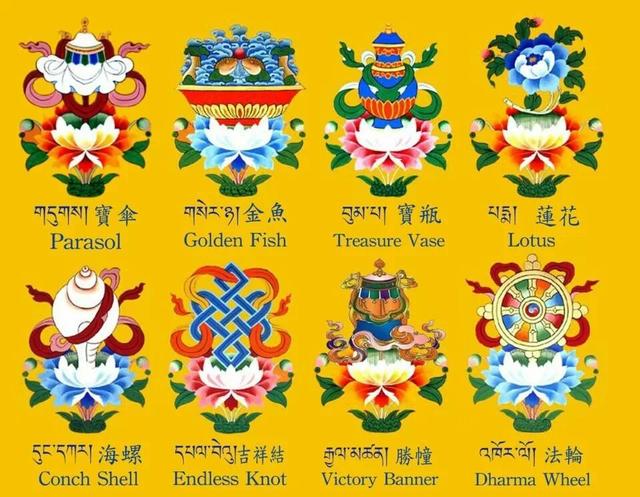 “佛教八寶”亦稱“吉祥八寶”或“八吉祥”或“八瑞相”等,即“輪螺傘蓋花罐魚長”,展開來就是法輪、法螺、寶傘、白蓋、蓮花、寶瓶(罐)、金魚(雙魚)、盤長(吉祥結)。