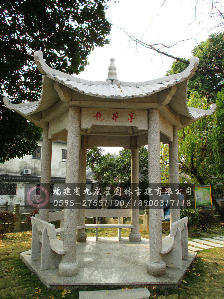 石雕涼亭是指用石頭加工而成的亭子,多建于路旁,供行人休息、乘涼或觀景用。石雕涼亭體量小,平面嚴謹。自點狀傘亭起,由簡樸而龐大,根本上都是規矩多少形體,或再加以組合變形,沒有圍墻。