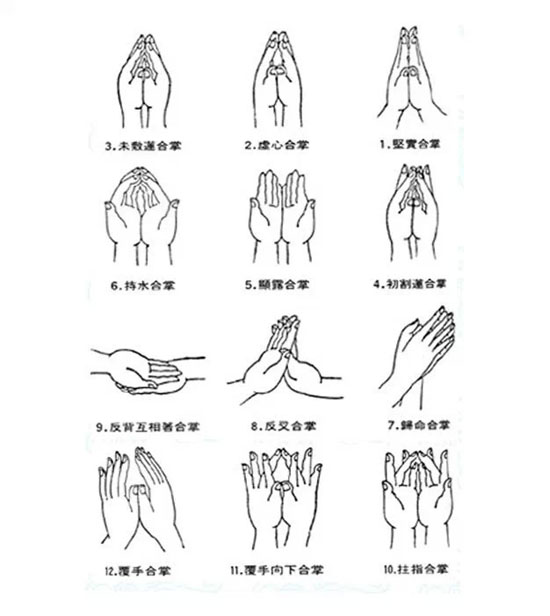 《大毗盧遮那經》里,定義了十二合掌與六種拳為基本之手印。