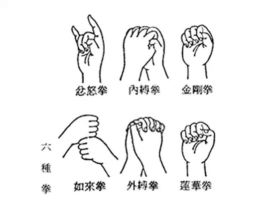 六拳包括金剛拳、蓮華拳、內縛拳、外縛拳、如來拳、忿怒拳。