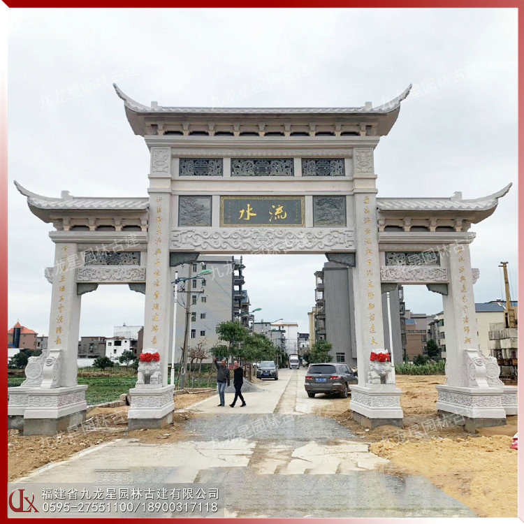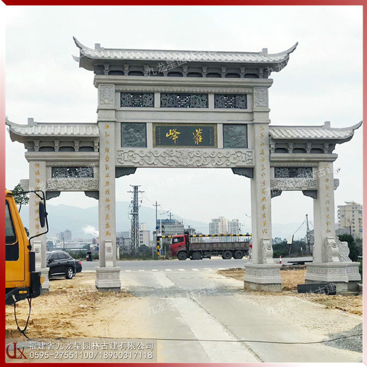 石雕三門牌坊,三門三樓石雕牌坊圖片,由石牌坊制作廠家九龍星園林古建制作。從石牌坊圖片來看,三門三樓石雕牌坊在不同場所應用是比較多的,像農村石牌坊、村莊石牌坊、宗祠石牌坊、墓地石牌坊、景區石牌坊、寺院石牌坊等,都有三門三樓石雕牌坊的身影。中國傳統的石雕技法圓雕、透雕、高浮雕、淺浮雕、平浮雕、陰線刻等,在三門三樓石雕牌坊的雕刻中廣為應用。