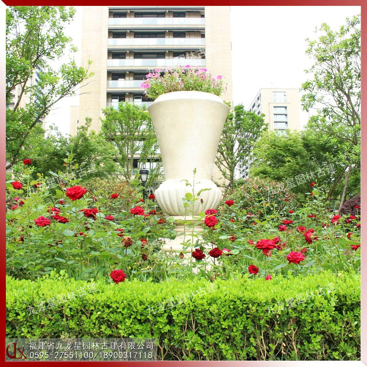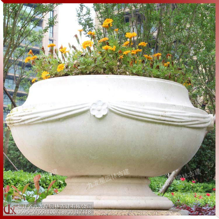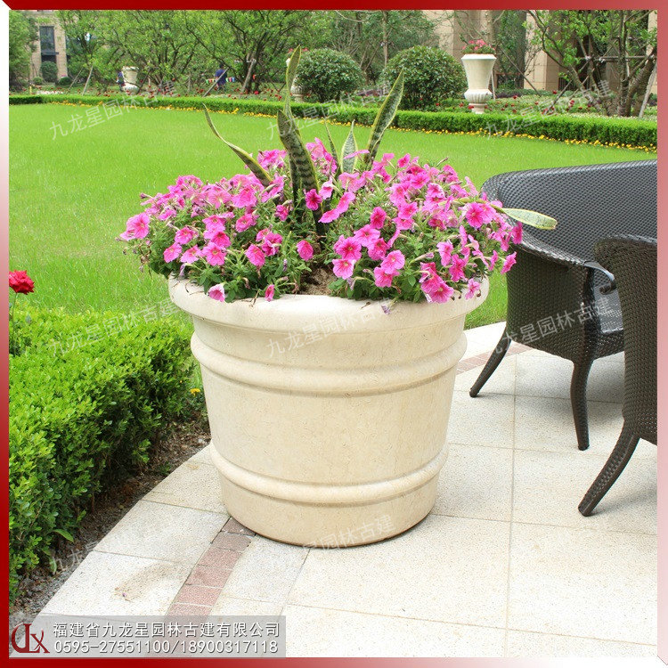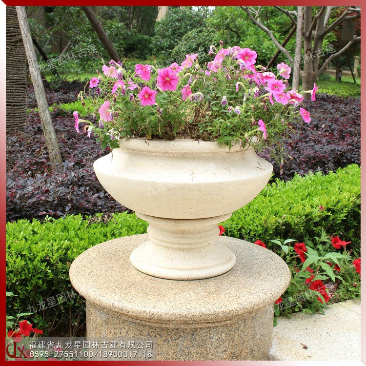 現代石雕花缽的造型不僅僅只是一個花缽,更是兼備了觀賞功能的藝術品。用一整塊石頭采用傳統工藝雕琢而成,其文化味也是十足的。加上花卉的點綴,更具有一種孤芳自賞的美感自然流出。